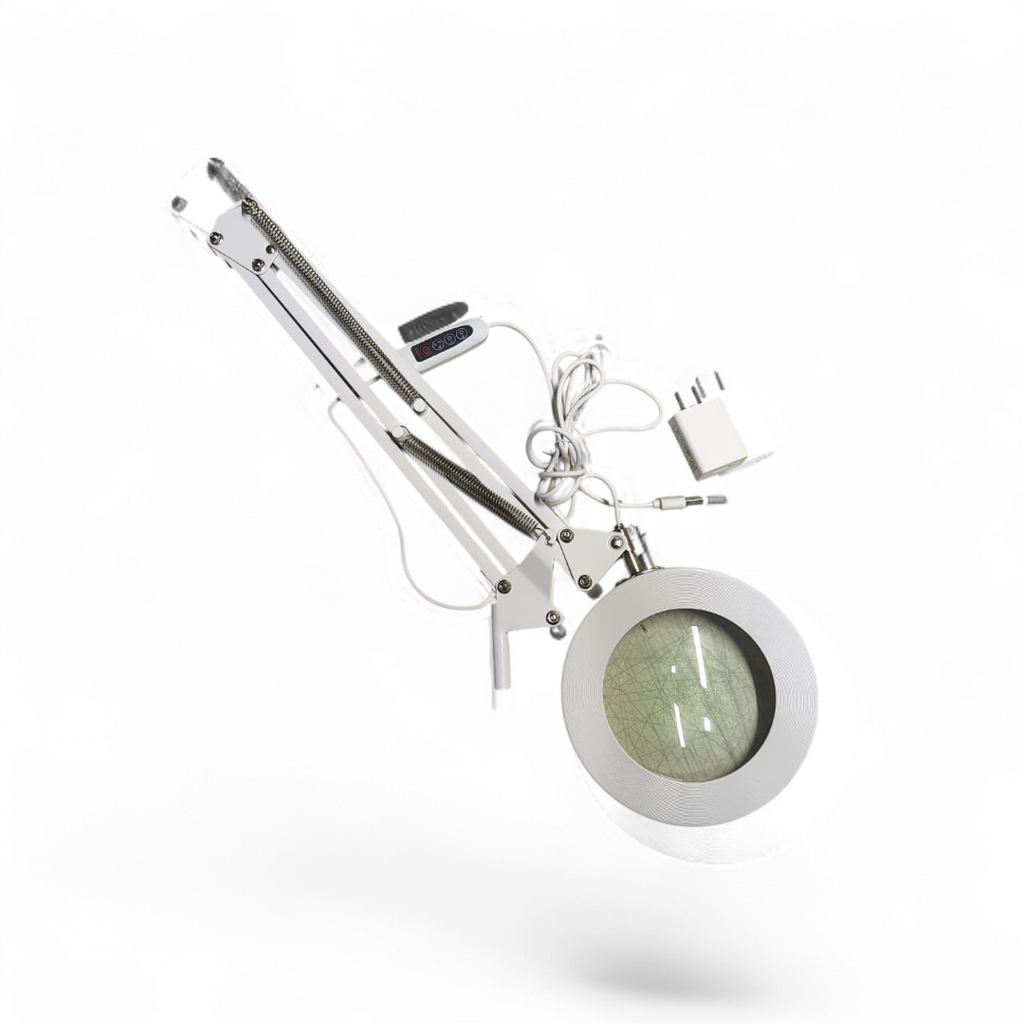 Lámpara de aumento (lupa) flexible es ideal para utilizarse en los spa, sala de belleza, estéticas, consultorios de belleza o cualquier lugar donde usted requiera de una luz más clara y con una mejor visión o claridad gracias a su lupa. Cuenta con un eliminador que se conecta directamente a la corriente eléctrica. Incluye una base redonda y resistente para colocar los pilares de apoyo y que la lámpara no se mueva o se caiga mientras la está usando, botón para encender y apagar la lámpara.